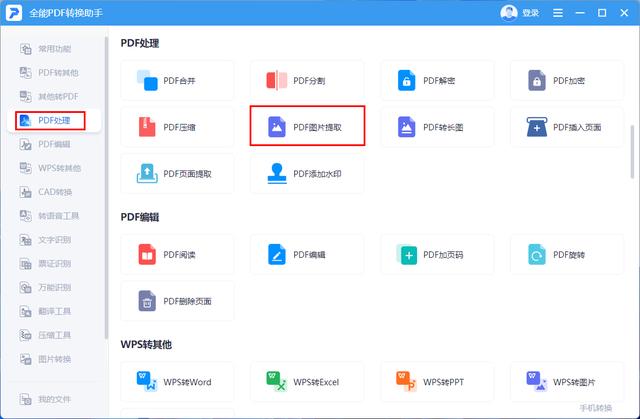 步骤一:进入主页后,找到【PDF处理】里面的【PDF图片提取】并点击;